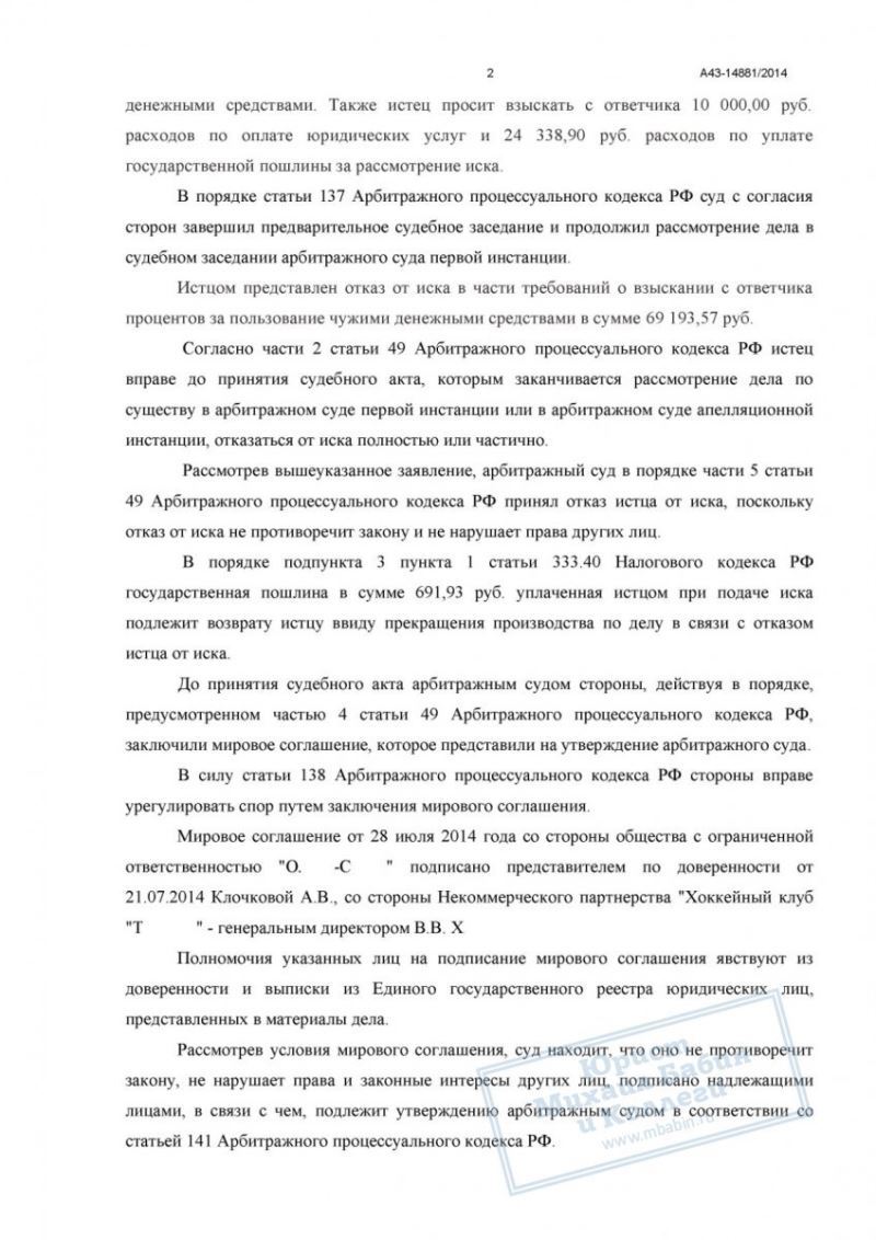 Взыскали 1 000 000 руб. с хоккейного клуба через мировое соглашение