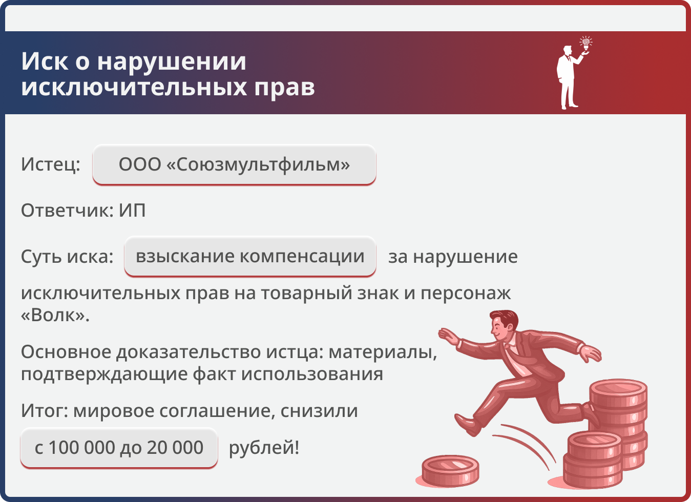 Минимизировать финансовые потери и защитить интересы ИП, обвиняемого в нарушении исключительных прав на товарный знак и персонаж «Волк», принадлежащих «Союзмультфильму».