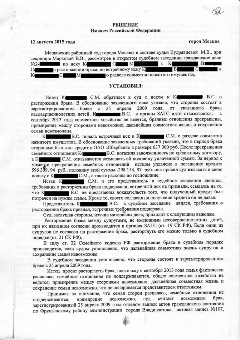 Клиент обратилась к адвокату, поскольку ее супруг подал в суд иск о расторжении брака, однако, у них имеется общий долг перед банком в размере 637 000 руб., который она самостоятельно погасила, а супруг отказывается компенсировать ей половину данной суммы.