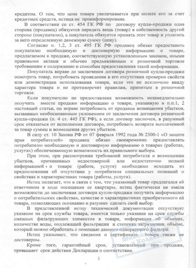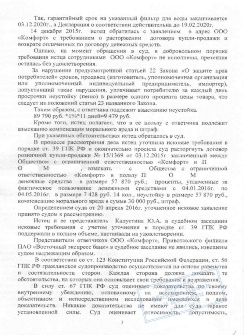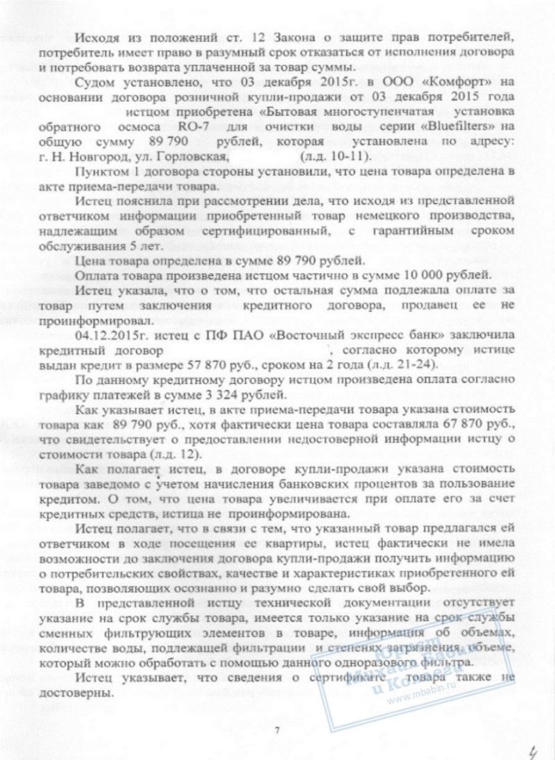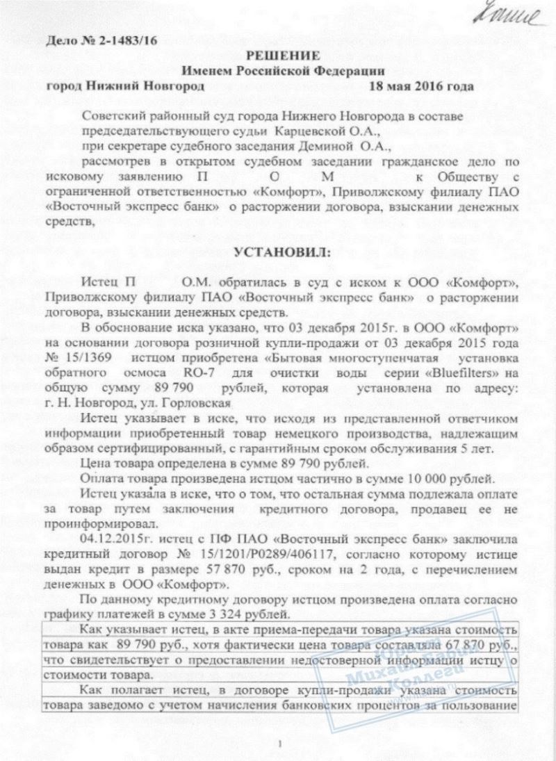 Вскоре стало ясно, что приобретение далеко не так совершенно, как это расписывал продавец. Оказалось, что "немецкое качество" - это не более, чем фигура речи, так как произведены фильтры в Польше. "Беспроцентный кредит" так же оказался фальшью - банковские проценты попросту уже были включены в стоимость товара. Техническая документация на прибор оказалась неполной, не существовало даже инструкции по использованию данных фильтров. И самое главное, П.О.М. осознала, что поторопилась с покупкой, но делать было нечего - на её имя уже был оформлен кредит.